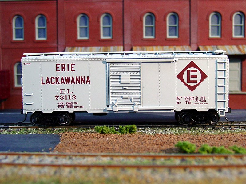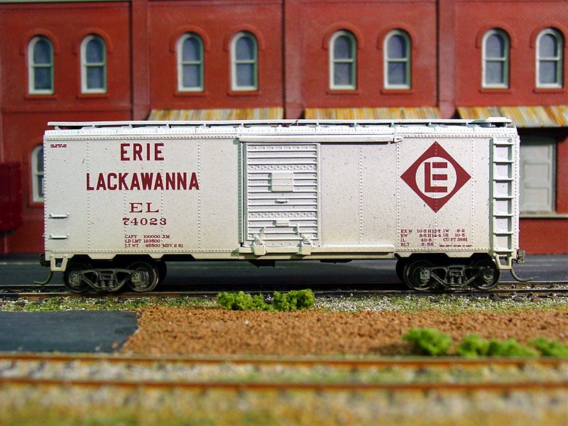 These 40' boxcars were painted up in the Erie Lackawanna's initial boxcar