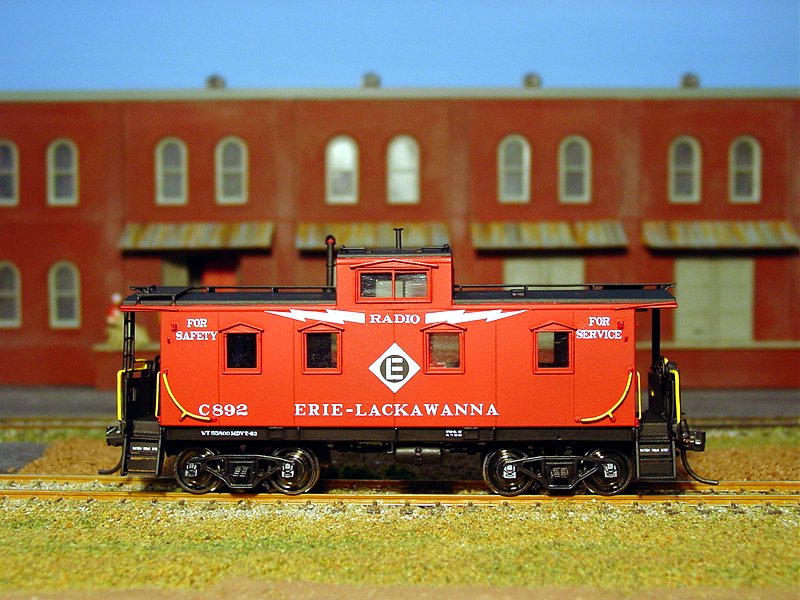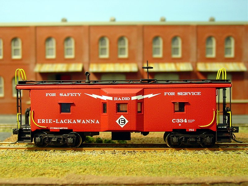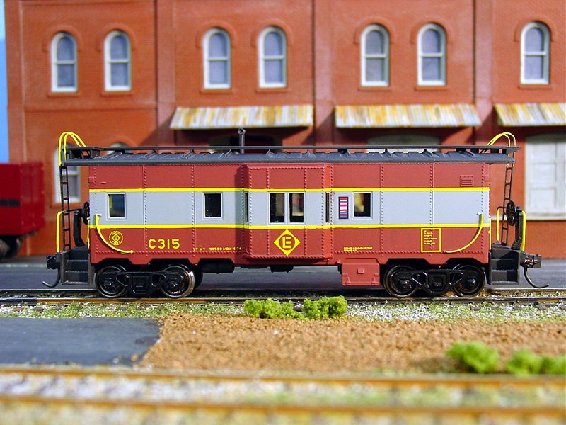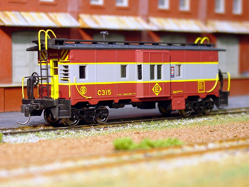 beautiful model of an Erie Lackawanna bay window caboose in the modern